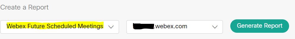 4. If your login account has entitlement to multiple sites then select the target site you are trying to run the report on via the far right drop down. On the far left SELECT A REPORT drop down , currently in a rather unintuitive approach, scroll all the way to the bottom then select WEBEX FUTURE SCHEDULE MEETINGS and hit the GENERATE REPORT button.